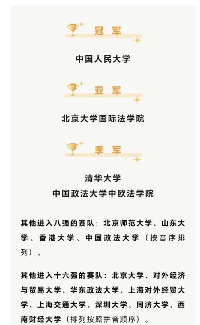 最终,与北京大学、对外经济与贸易大学、华东政法大学、上海对外经贸大学、同济大学等高校一同成功入围16强。