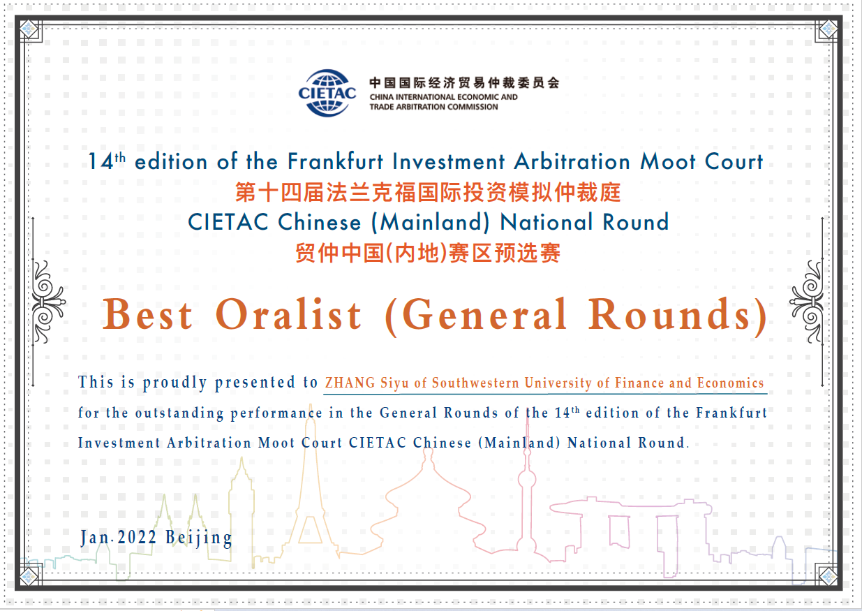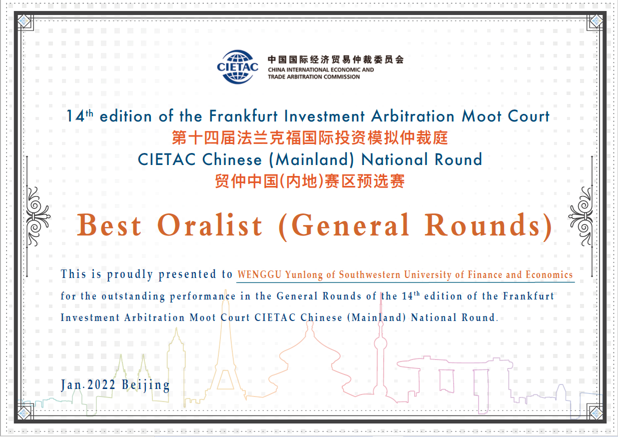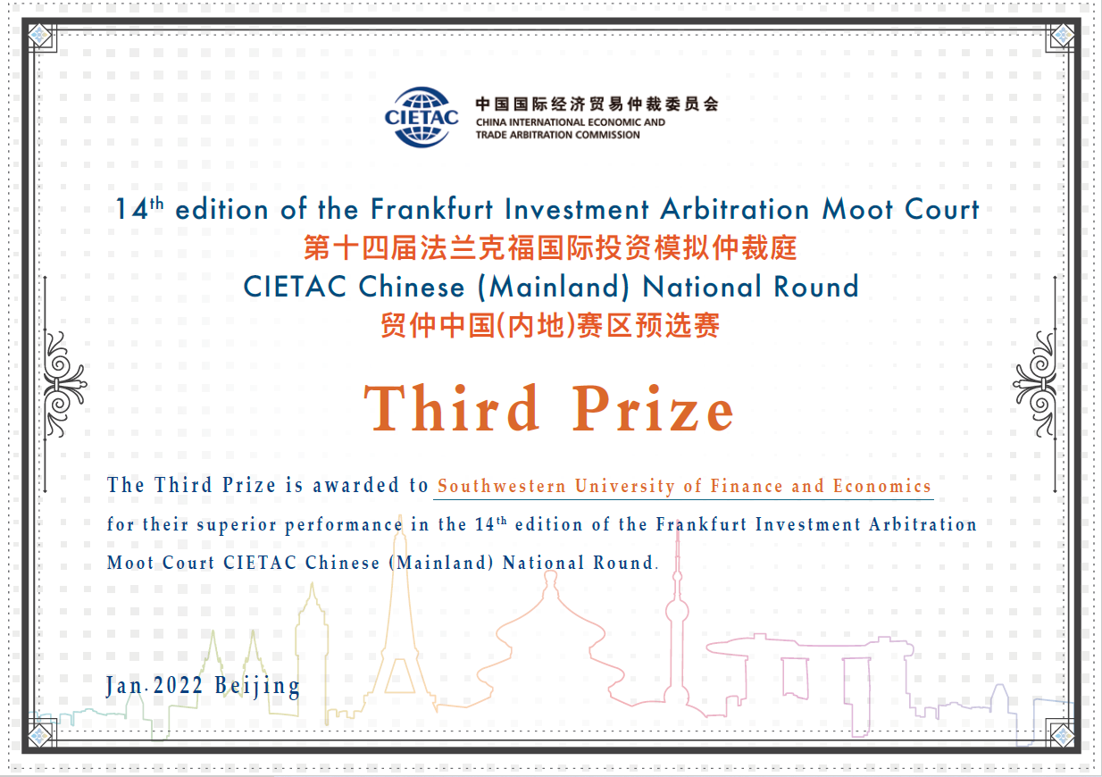 2022年1月19日至21日,第十四届法兰克福国际投资模拟仲裁庭-贸仲中国(内地)赛区预选赛(14th edition of the Frankfurt Investment Arbitration Moot Court - CIETAC Chinese (Mainland) National Round)在线上如期举行。经过为期三天的精彩模拟仲裁庭审,公司代表队从24支队伍中脱颖而出,荣获三等奖,其中队员翁古云龙、张思语荣膺循环赛最佳辩手奖项。