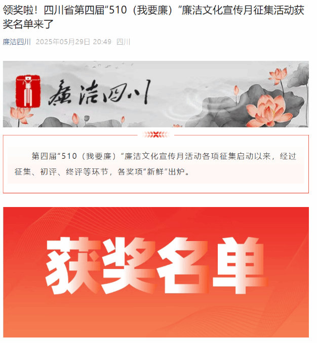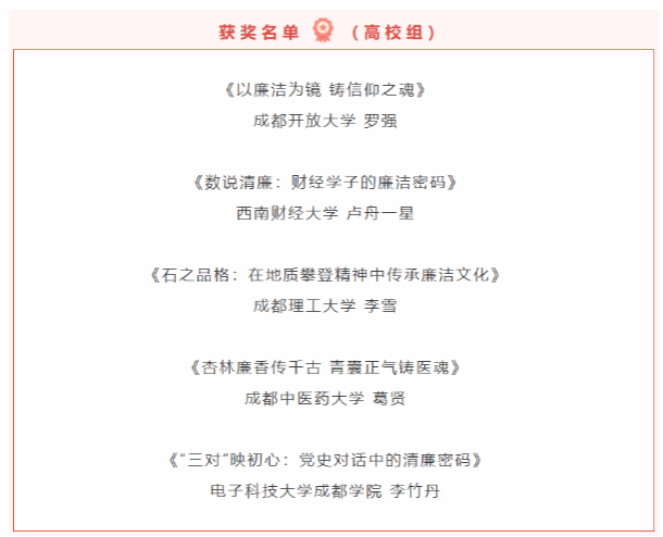 近日,由四川省纪委监委、省委宣传部联合主办的四川省第四届“510(我要廉)”廉洁文化宣传月活动评选结果揭晓,公司专职辅导员卢舟一星老师主讲的廉洁思政课《数说清廉:财经学子的廉洁密码》喜获省级三等奖。