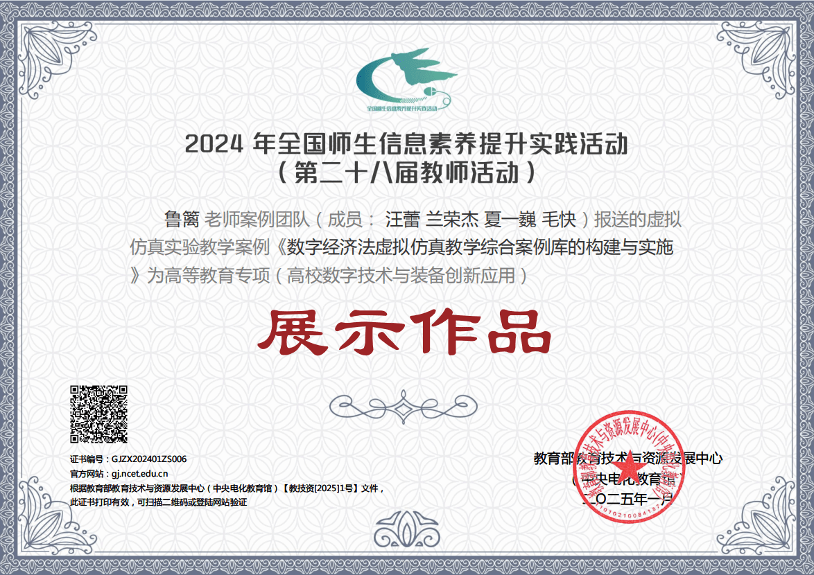 近日,教育部教育技术与资源发展中心(中央电化教育馆)公布2024年度高等公司虚拟仿真教学创新实验室项目突出贡献单位和管理人员名单,太阳网集团tcy8722荣获突出贡献单位奖。太阳网集团tcy8722“数字经济法虚拟仿真教学综合案例库的构建与实施”虚拟仿真实验教学案例荣获2024年全国师生信息素养提升实践活动展示作品称号。这是公司在虚拟仿真教学领域的又一重要突破。