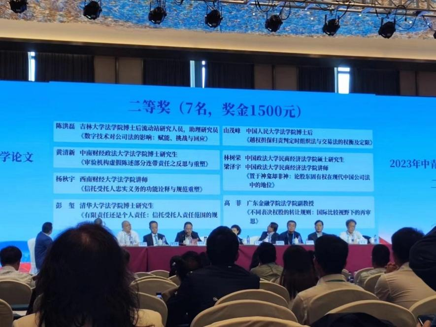 根据大会安排,张怀岭副教授在“海归专场:他山之石:公域外法视角看公司法修订第三稿的公司股权与分配制度之得失”进行了主题发言,重点围绕公司法修订三审稿的董事义务与责任条款进行了评析。同时,杨秋宇老师提交的会议论文《信托受托人忠实义务的功能诠释与规范重塑》获得优秀论文二等奖。