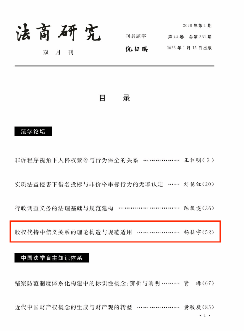 公司杨秋宇副教授在《法商研究》2026年第1期上发表高质量学术论文《股权代持中信义关系的理论构造与规范适用》。《法商研究》是由中南财经政法大学主管、主办的法学学术性理论期刊,面向国内外公开发行。1957年创刊,1986年复刊,自1994年第2期以来为双月刊。该刊为中文社会科学引文索引(CSSCI)来源期刊、全国中文法律类核心期刊、中国人文社会科学核心期刊、RCCSE中国权威学术期刊。