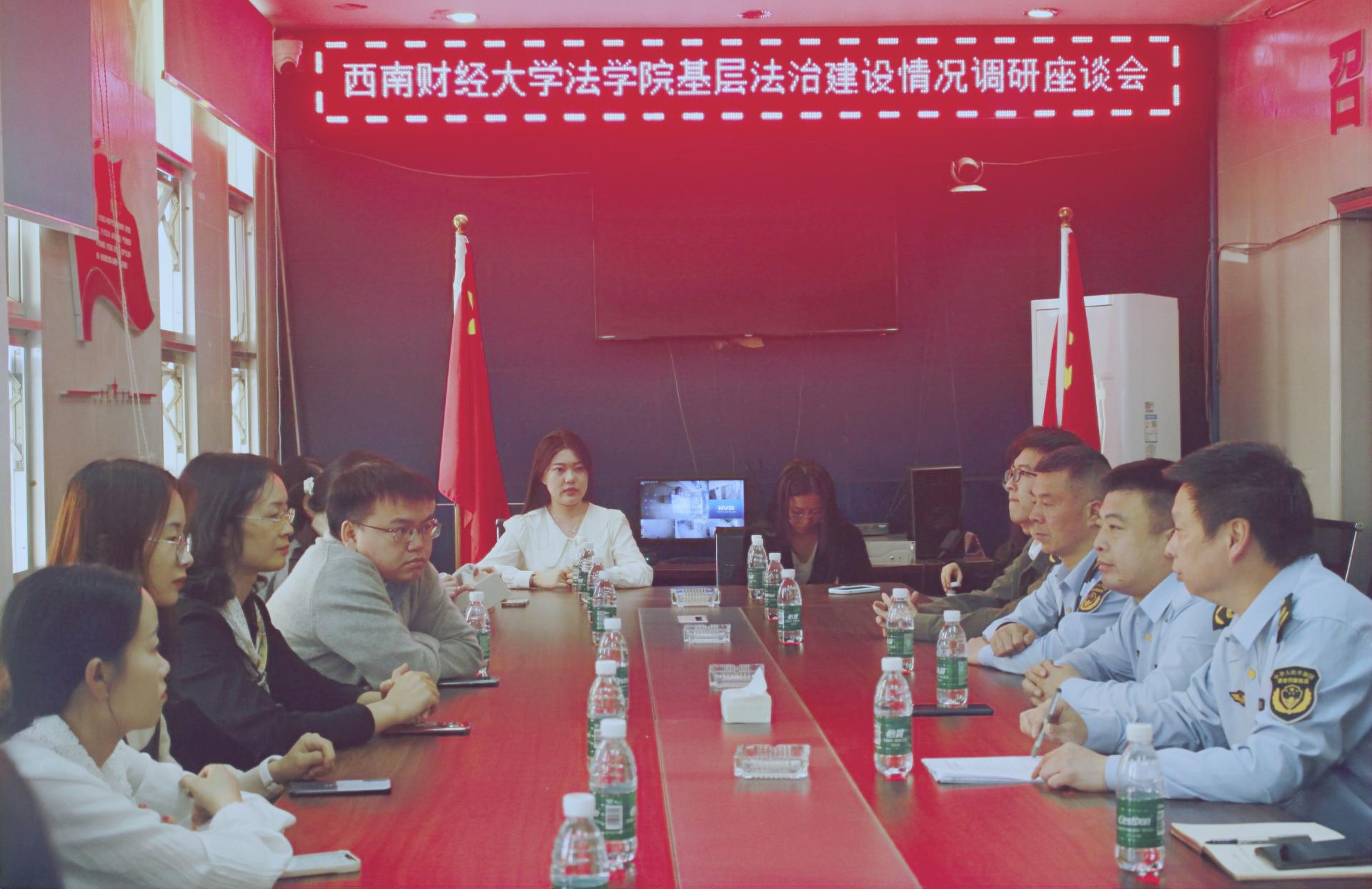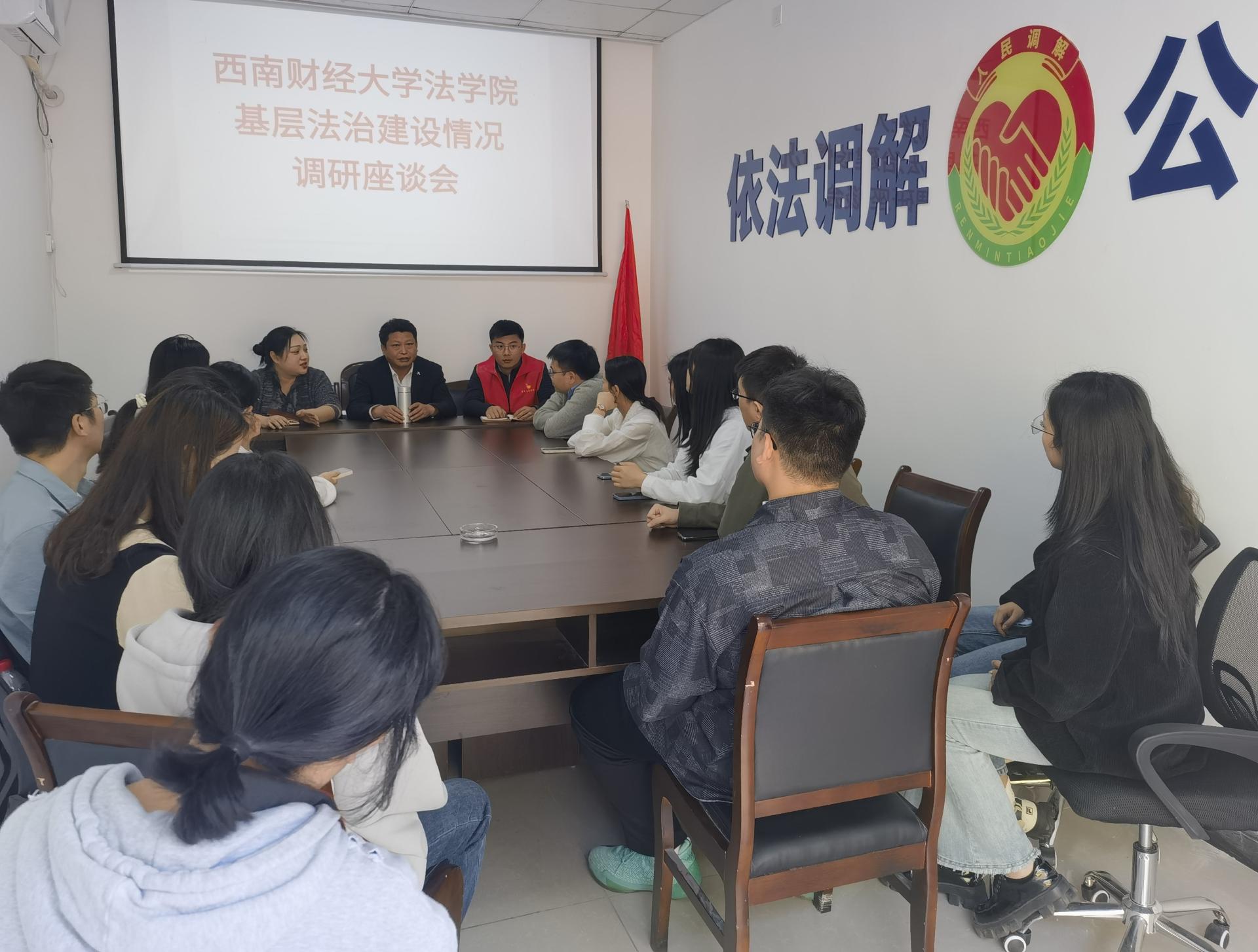 随后,师生一行前往石盘街道司法所、成都市人大常委会基层立法点和石盘街道综合执法队调研基层法治建设情况。在司法所调研会上,司法所徐慧琳和法律服务所付能箭详细介绍了司法所的人民调解、社会矫正、法律援助、法治宣传等方面的工作,并解答了同学们提出的问题。