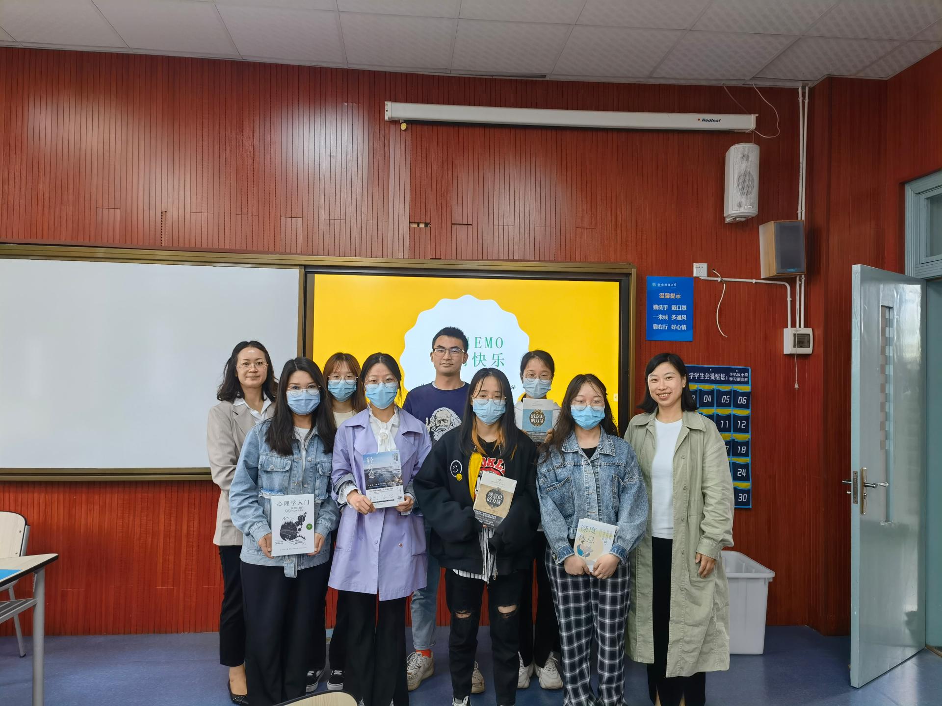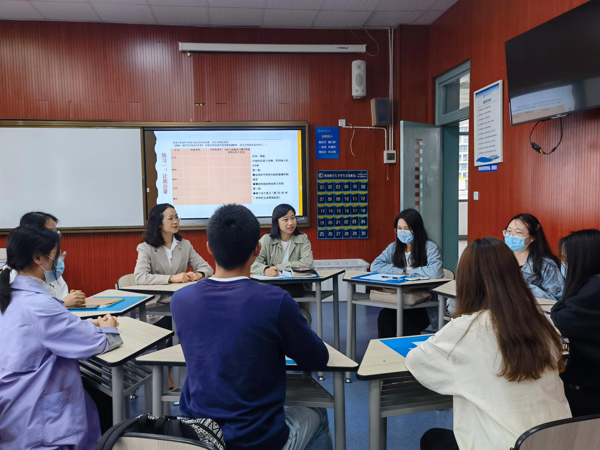 本次活动在严霞和伍泽莲老师两位老师的带领下开展。严老师带大家一起从游戏开始,释放压力,舒缓心情,打开心扉。伍泽莲老师带大家一起完成了“让我自豪”的团体辅导活动。本次活动通过游戏互动和交流,每个人真都诚投入,转变态度,增长自信,带着快乐的心情,以更好的心态投入到学习生活中。