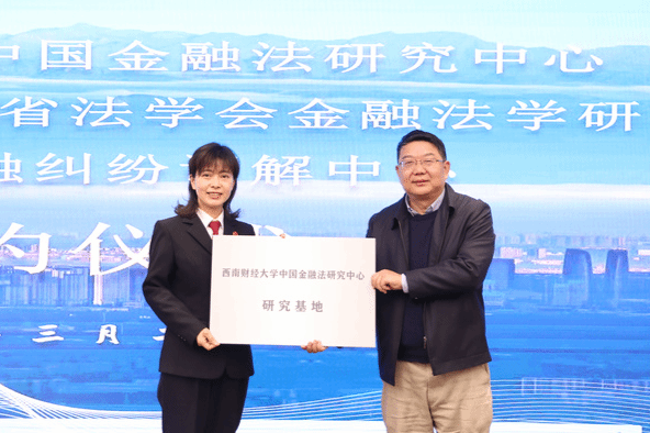 随后高晋康教授代表太阳网集团tcy8722中国金融法研究中心向成都铁路运输第一法院授予研究基地牌匾
